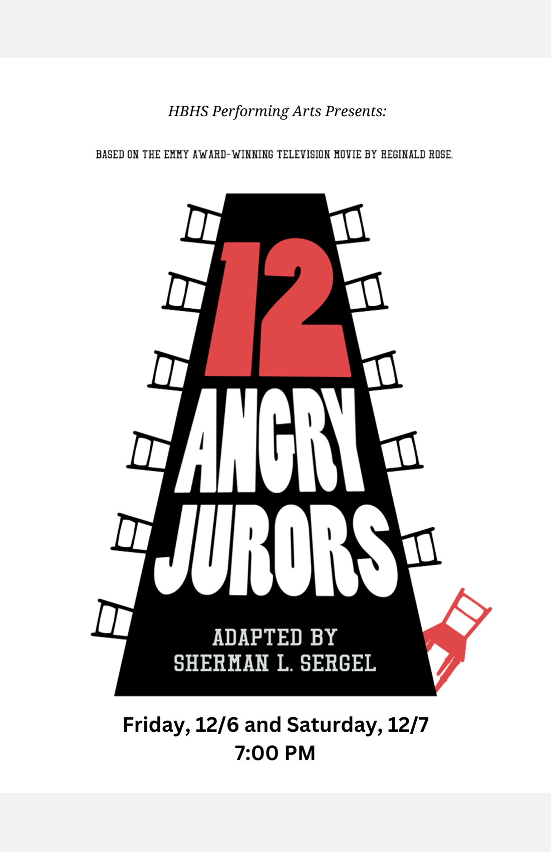 Tickets will only be sold at the door if seats remain available. Ticket availability will be updated on the HBHS Twitter account, the HBHS website, and the HBHS 12 Angry Jurors Facebook Event Page.